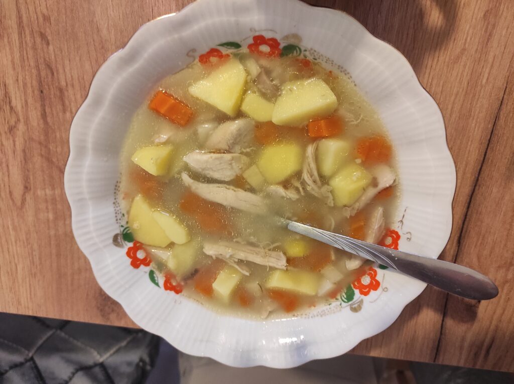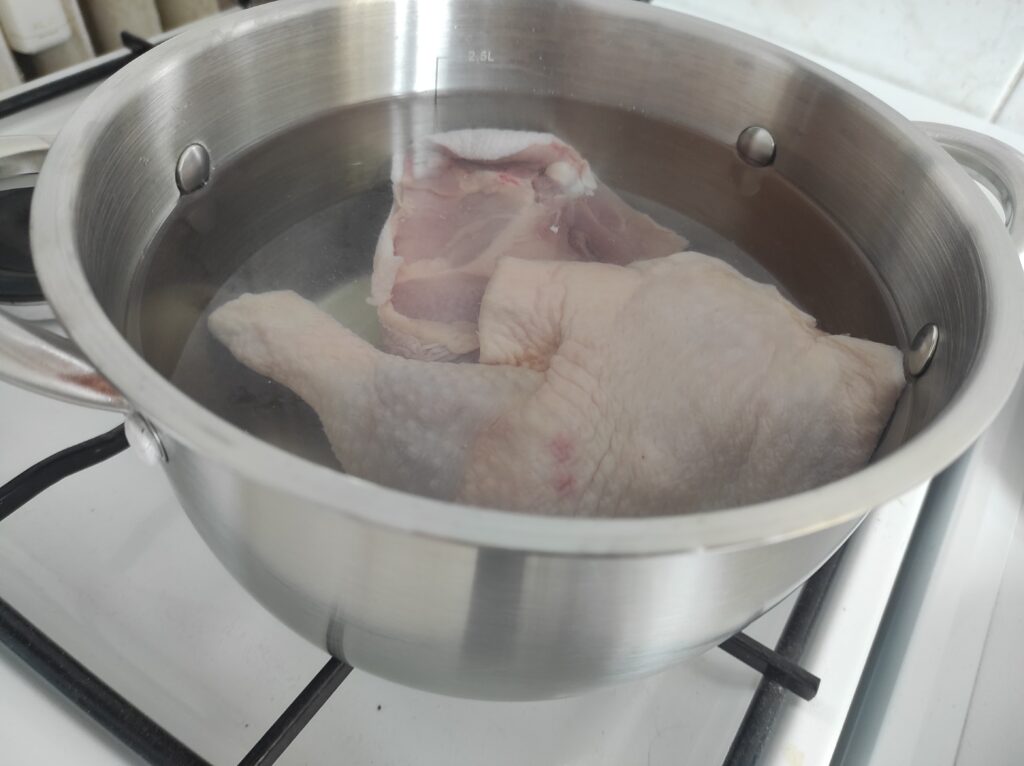 Pierwszy etap: Dwie nogi kurczaka opłucz w wodzie i włóż do garnka. Garnek musi mieć pojemność minimum 2,5 litra, inaczej sens zrobienia domowej zupy zniknie, bo będzie jej za mało. Następnie musisz zalać kurczaka wodą, na tyle, aby był zakryty. Teraz, proszę, przykryj garnek i daj do lodówki na 2 godziny. Po 2 godzinach wylej całą wodę i przepłucz kurczaka raz jeszcze. Po co ten zabieg? Otóż zupa będzie finalnie smaczniejsza. Takie namaczanie w wodzie sprawia, że jeśli kurczak miał w sobie chemię lub jakieś antybiotyki, to mamy większą szansę na wypłukanie tego z mięsa.