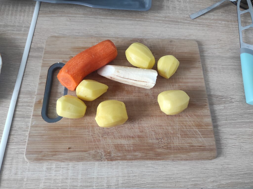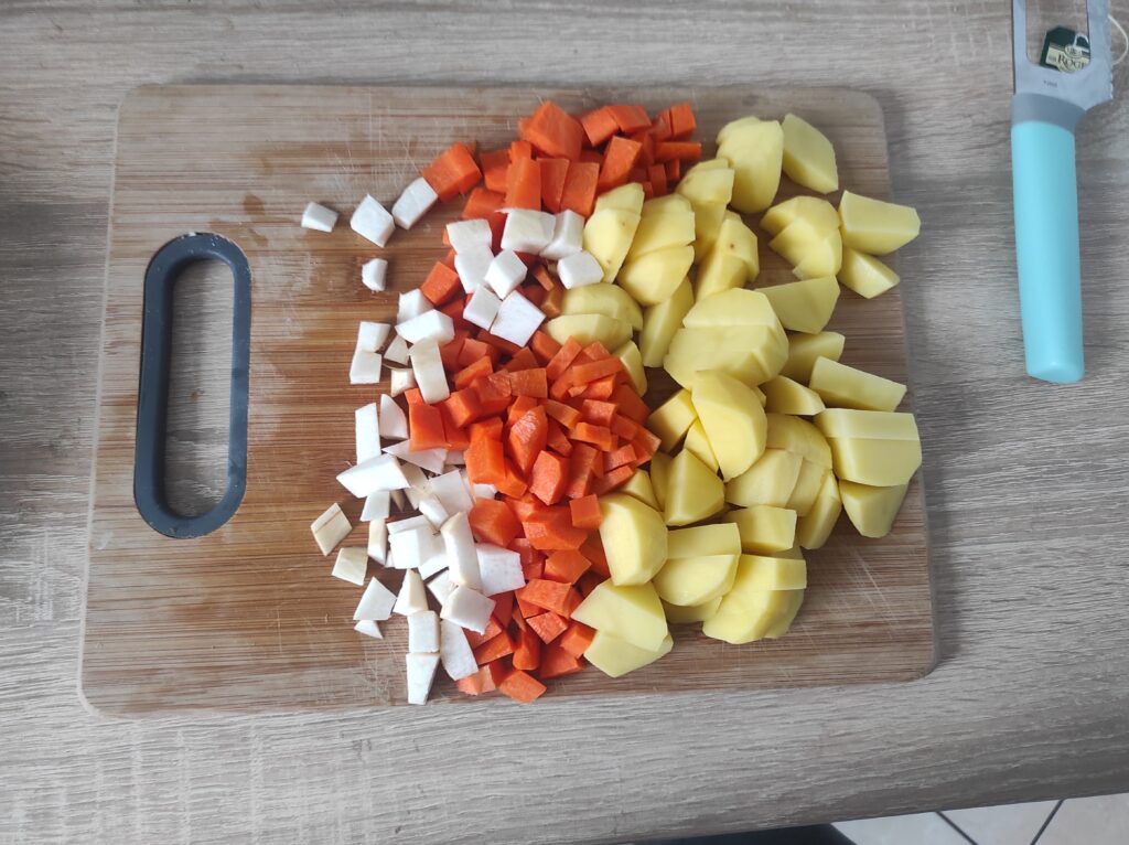 Marchew, ziemniaki, pietruszkę pokrój na kawałki. Ziemniaki zostaw w większych kawałkach, ponieważ szybciej zrobią się miękkie.