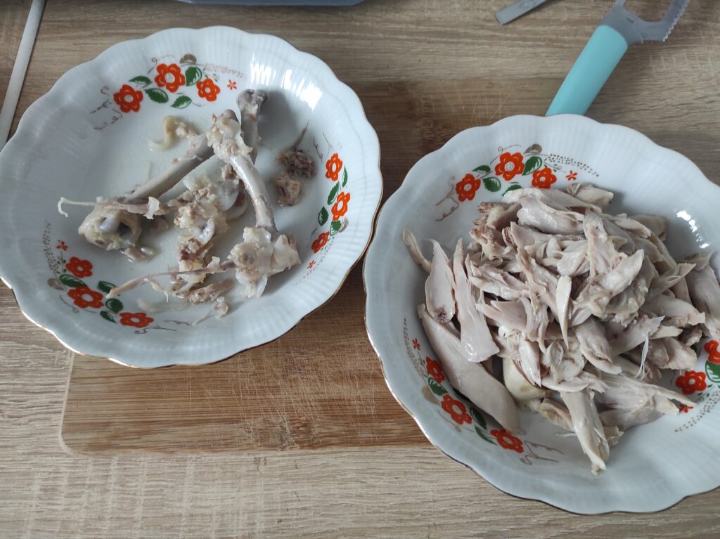 Możesz oddzielić kości od mięsa bez użycia noża ani widelca, lecz rękami, ja tak robię. Przygotuj sobie dwa talerze: na jednym odkładaj: kości, skórę, chrząstki. a na drugi talerz: samo mięso. Wyrzuć wszystko poza mięsem: teraz interesuje nas samo mięso. Mięso podzielić możesz na mniejsze kawałki, również rękami.